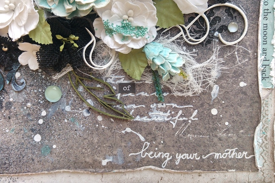 I was really inspired my this months challenge at More Than Words they have a lovely theme this month. The word is "Mother"and to add flowers so I really did that using my precious Maja Design papers. I used the pretty Nyhavn sheet as my background and added two other colors to make the picture pop of my layout. It's totally a different style then what I was creating before I trew it away....because that was all pink and girly. I really love to create with pink but this time it didn't work at all. I used some stencils on my background with some black paste this time.