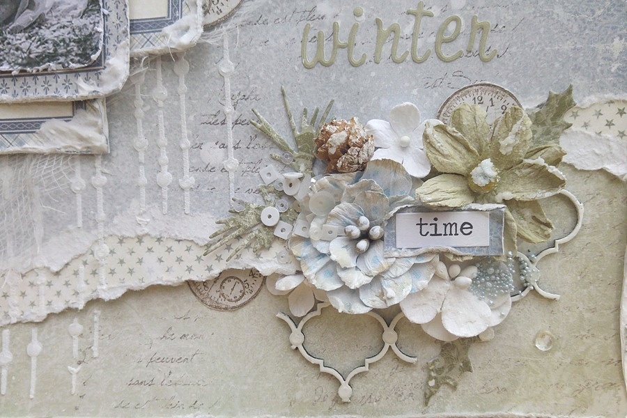 This layout was made with the pretty new Maja Design collection "Joyous Winterdays" I added a lot of mixed media elements like paste, stamps, a stencil clear drops, prills, snow, glass glitter, sprays and some crackle paste. This was a really fun page to create eventhough I don't like winter I do love making winter layouts. The chipboards are treated with gesso {white} crackle paste and snow effects and a touch of gliss glitter.