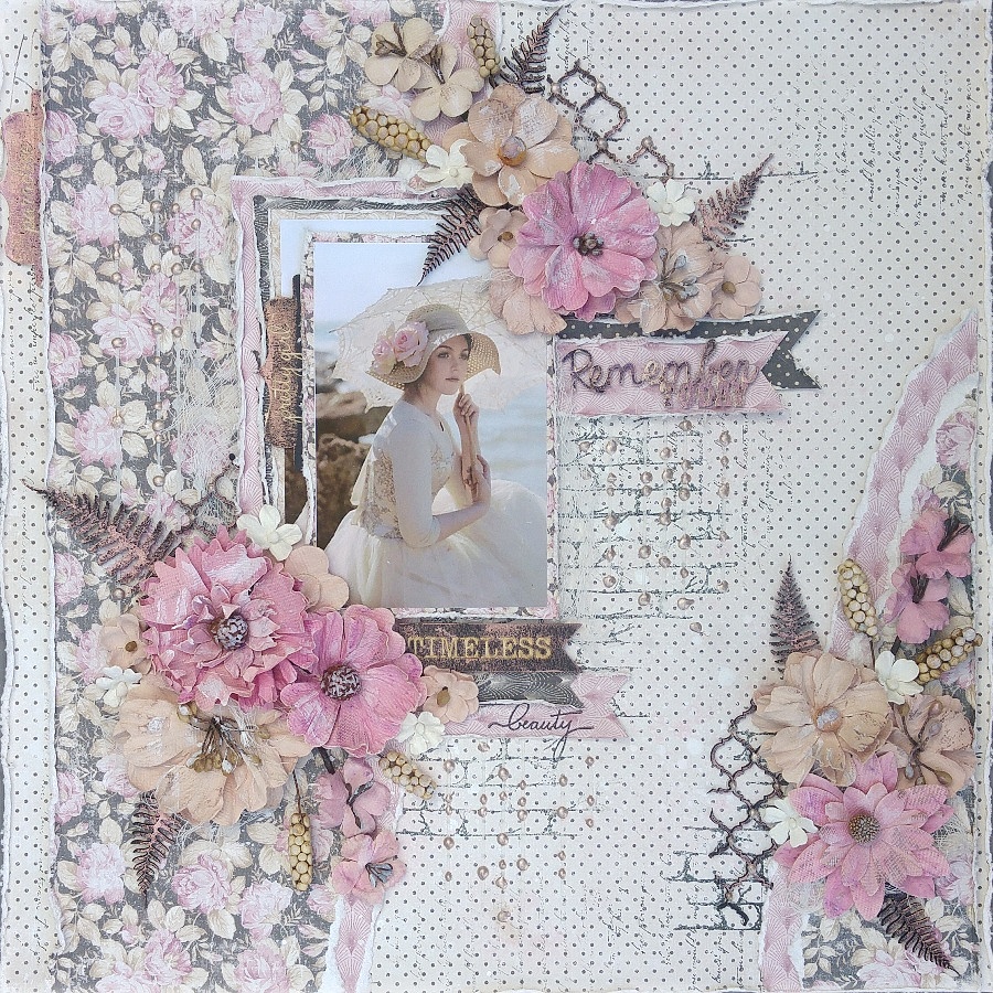 Today it's me again on this lovely blog to show you a layout I have created with the newest collection. I really enjoy creating with it because it's so versatile. Lately I am hooked on vintage pictures especially from vintage clothing but also lace umbrella's, beautiful hats with flowers and amazing dresses they made in the sixties and before and after...so I thought why not make a layout with it, it totally went great with the colors of the "Celebration"collection and the new flowers from 49 and Market what a wonderful combination that is right?